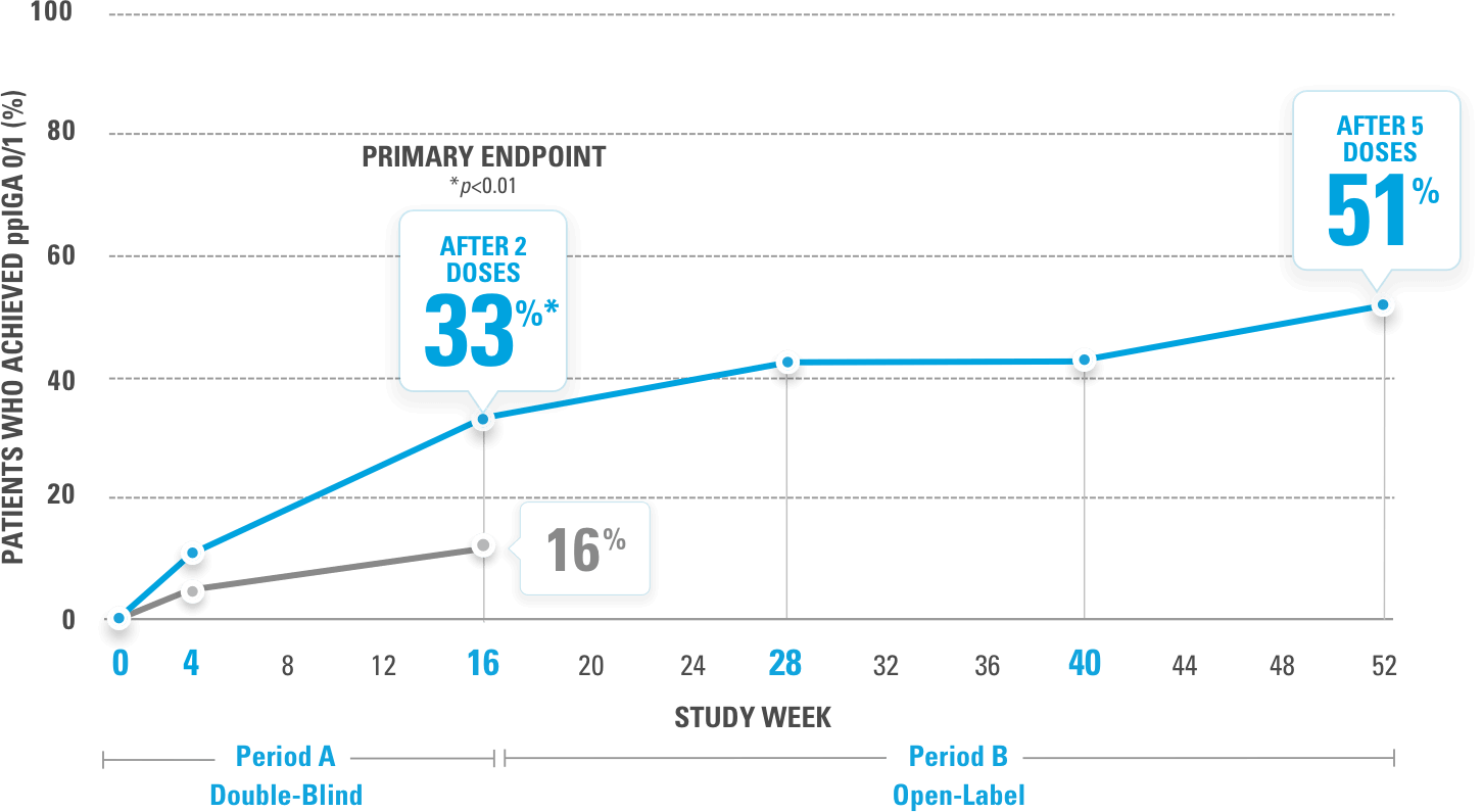 PERCENTAGE OF PATIENTS ACHIEVING sPGA-G* O/1 AT WEEK 16 (NRI)