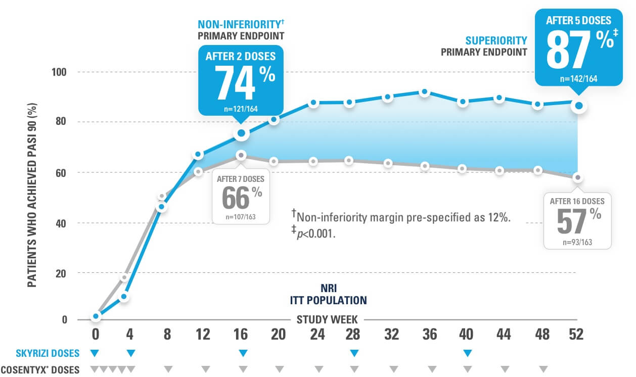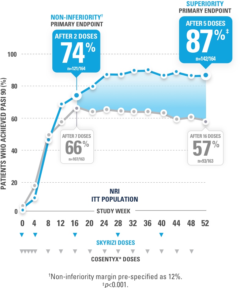 The head-to-head study was an open-label, assessor-blinded, 52-week study where patients were randomized 1:1 to receive either SKYRIZI 150 mg (two 75 mg injections) at Weeks 0, 4, and every 12 weeks until the last dose at Week 40; or COSENTYX* 300 mg (two 150 mg injections) at Weeks 0, 1, 2, 3, 4, and every 4 weeks until the last dose at Week 48.2