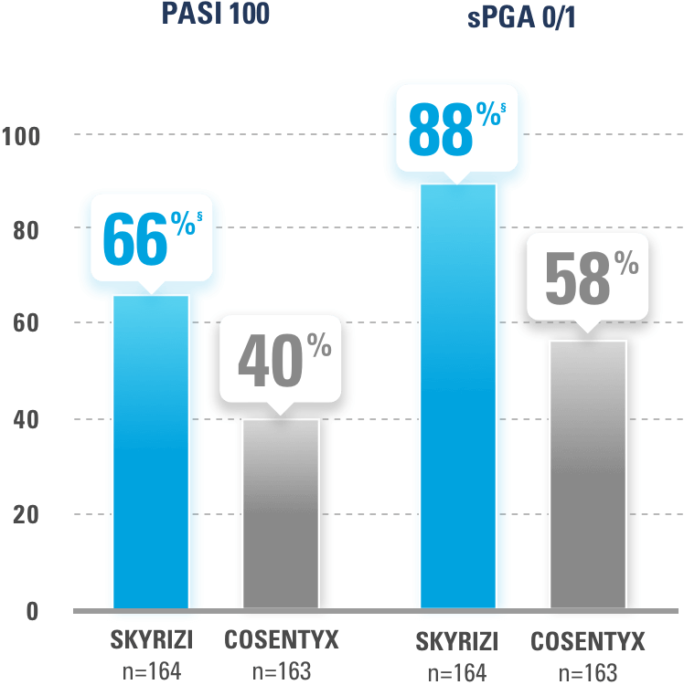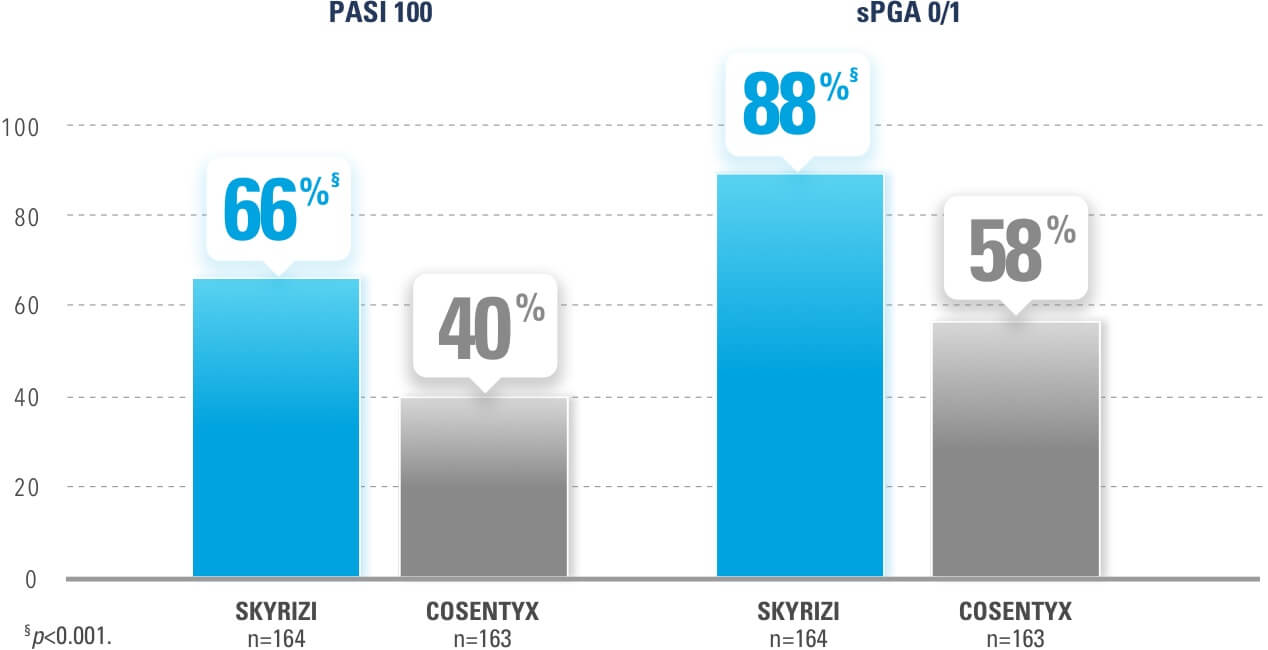 SKYRIZI® demonstrated superior rates of PASI 100 and sPGA 0/1 at Week 52. SKYRIZI® demonstrated superior rates of PASI 100 and sPGA 0/1 at Week 52. SKYRIZI® demonstrated superior rates of PASI 100 and sPGA 0/1 at Week 52.