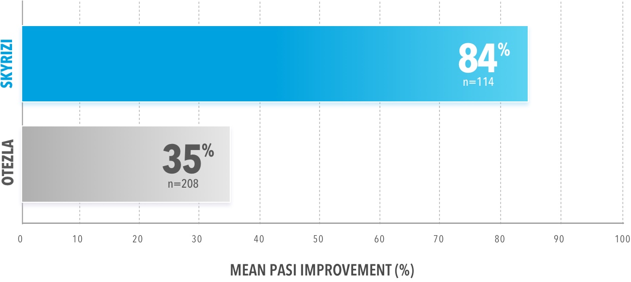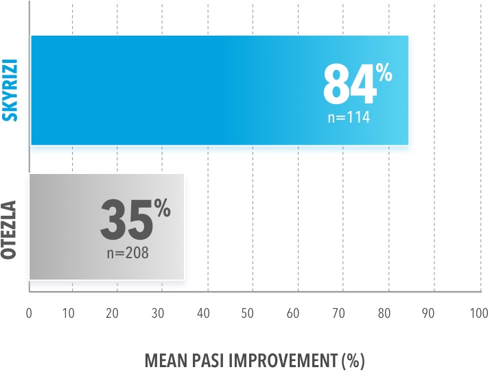 PASI 75 at Week 16: SKYRIZI: 85% (n=100/118), OTEZLA: 19% (n=44/234)