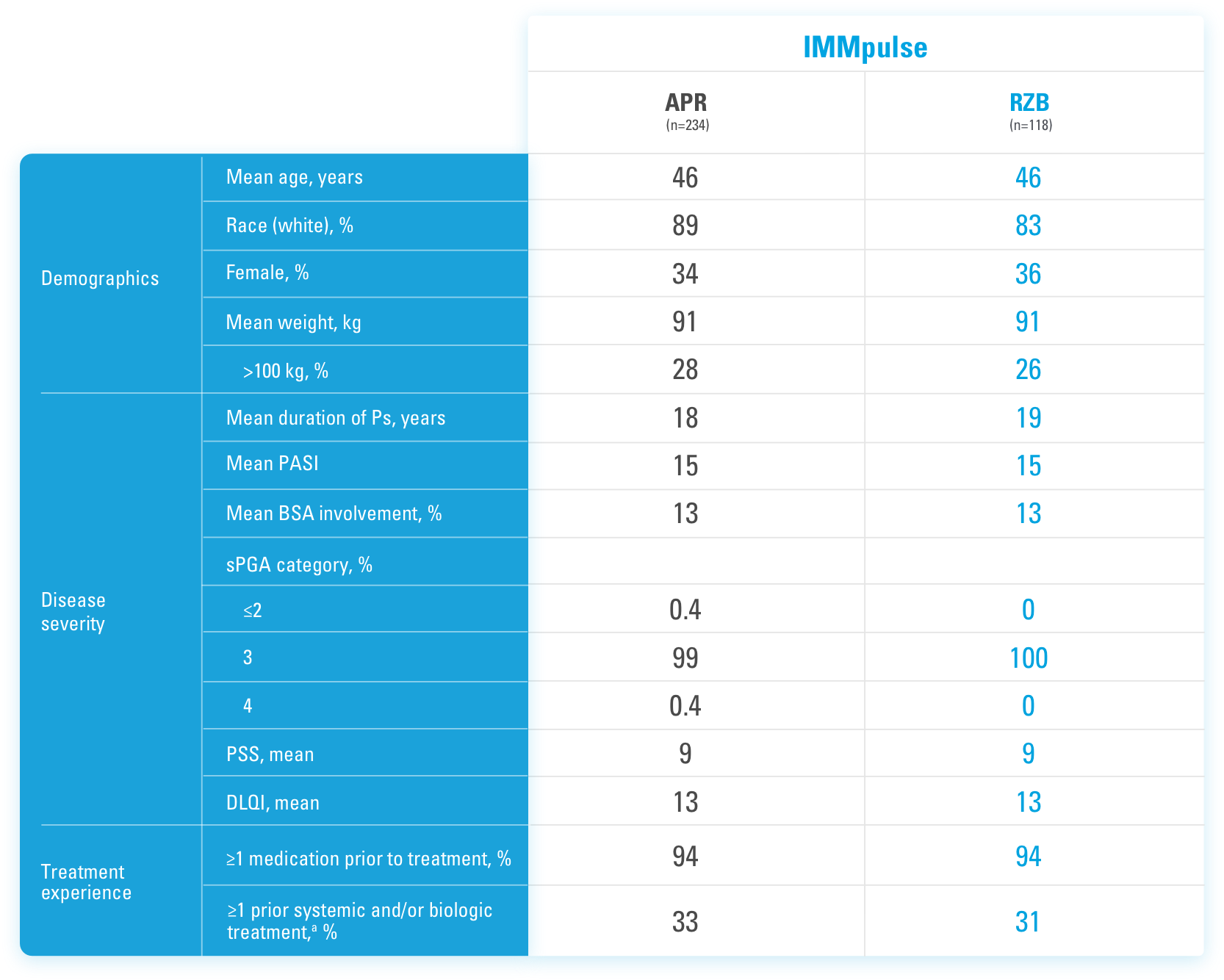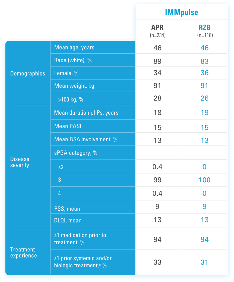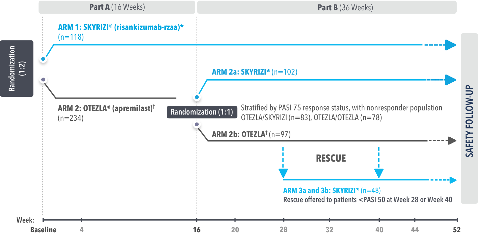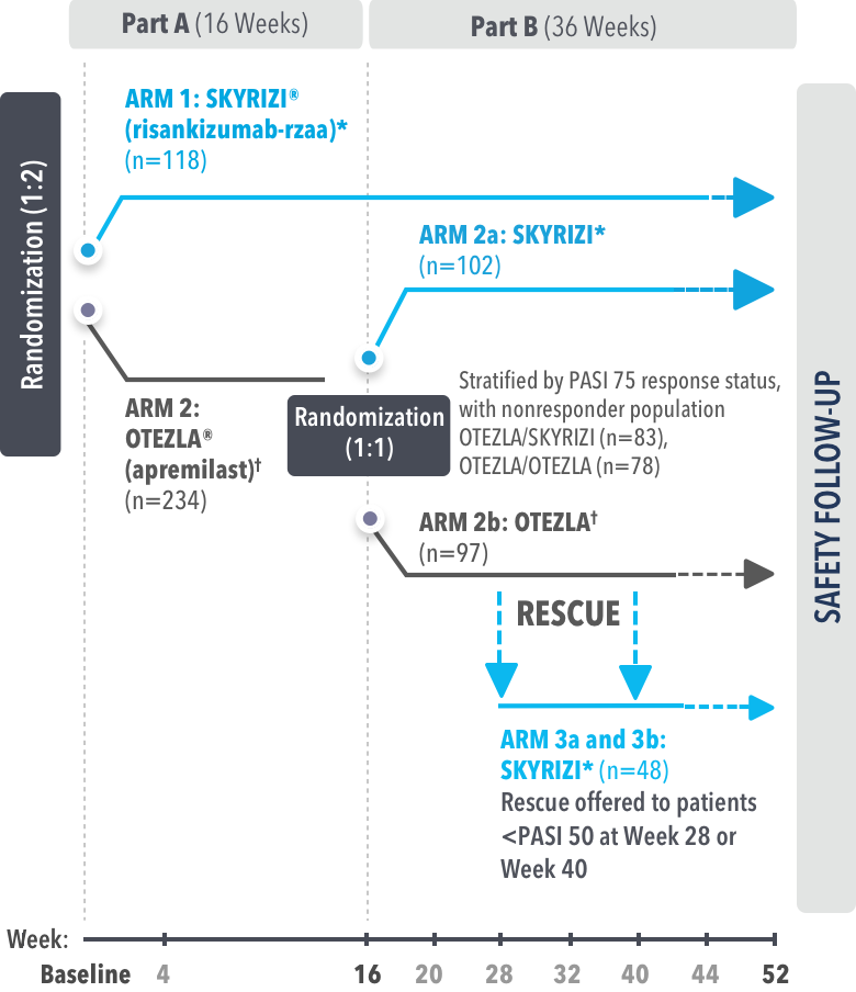 IMMpulse was a 52-week, Phase 4, multicenter, randomized, open-label, efficacy assessor-blinded study of SKYRIZI compared to OTEZLA for the treatment of adults with moderate plaque psoriasis who are candidates for systemic therapy. Patients were randomly assigned (1:2) to either SKYRIZI 150 mg as a single subcutaneous injection at Week 0, Week 4, and every 12 weeks thereafter or OTEZLA 30 mg orally twice daily, post-titration per label. The co-primary endpoints of Period A were achievement of PASI 90 and sPGA 0/1 at Week 16. The primary endpoint of Period B was achievement of PASI 90 at Week 52 among patients who failed to achieve PASI 75 with OTEZLA at Week 16. Patients were eligible for inclusion in this study if they had baseline PASI ≥12, BSA 10%-15%, and sPGA=3.2