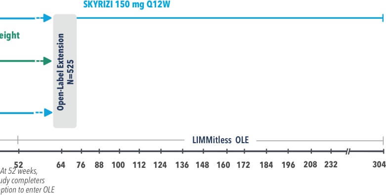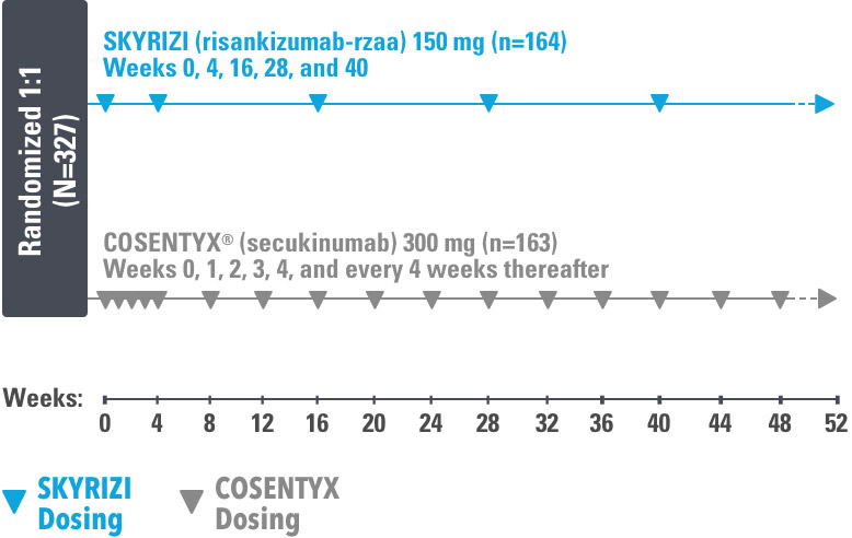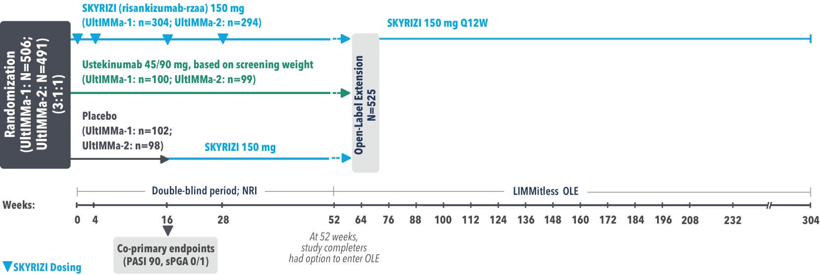 UltIMMa-1 (N=506) and UltIMMa-2 (N=491) were replicate Phase 3, randomized, double-blind, placebo- and active-controlled studies to evaluate the efficacy and safety of SKYRIZI (150 mg) vs placebo over 16 weeks and biologic active control (45 mg or 90 mg, based on screening weight) over 52 weeks in adult patients with moderate to severe plaque psoriasis. Patients received SKYRIZI 150 mg at Week 0, Week 4, and every 12 weeks thereafter.1,4