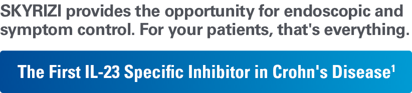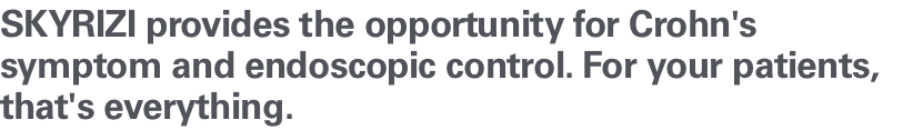 SKYRIZI provides the opportunity for endoscopic and symptom control. For your patients that's everything. The first & only IL-23 specific inhibitor in Crohn's disease
