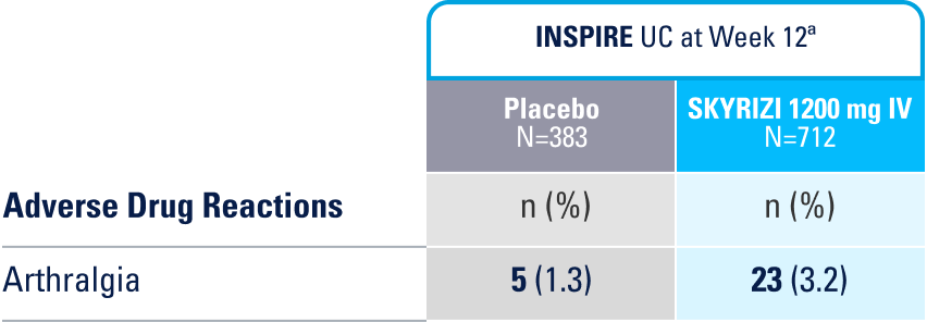 IN THE UC 12-WEEK INDUCTION STUDY, THE MOST COMMON ADVERSE REACTIONS (≥3% OF PATIENTS AND AT A HIGHER RATE THAN PLACEBO) INCLUDE ARTHRALGIA.1