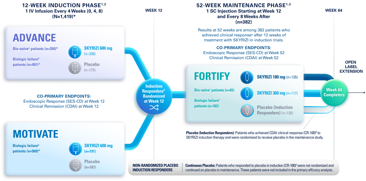 *Safety data were evaluated for all patients receiving ≥1 dose of SKYRIZI from clinical trials, including open-label extension and dose-ranging studies.2