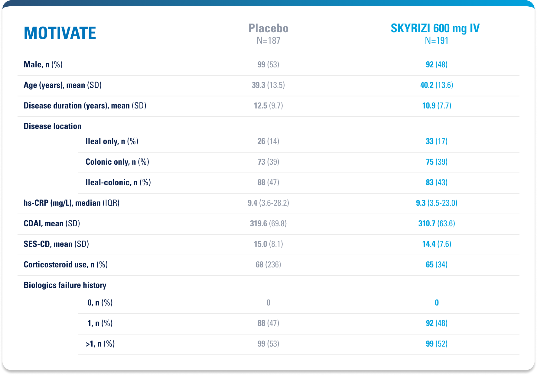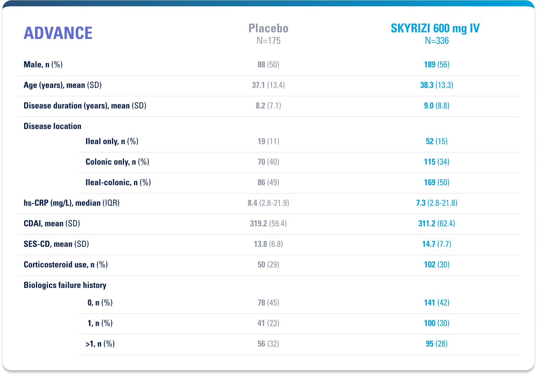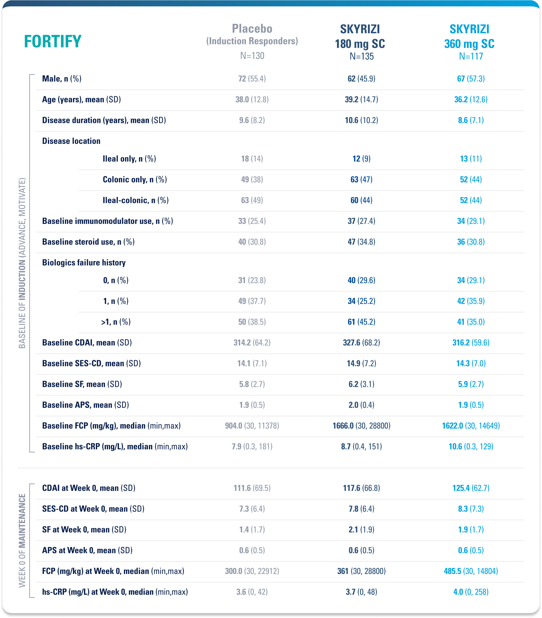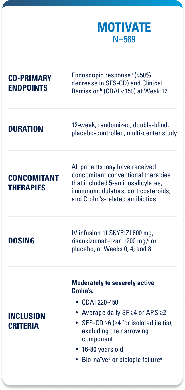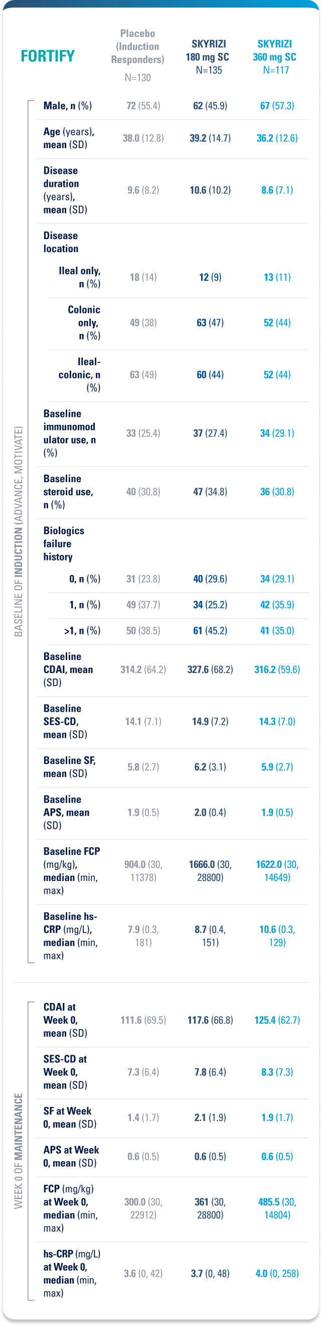 Placebo (Induction Responders): Patients who achieved CDAI clinical response (CR-100)¶ to SKYRIZI induction therapy and were randomized to receive placebo in the maintenance study.