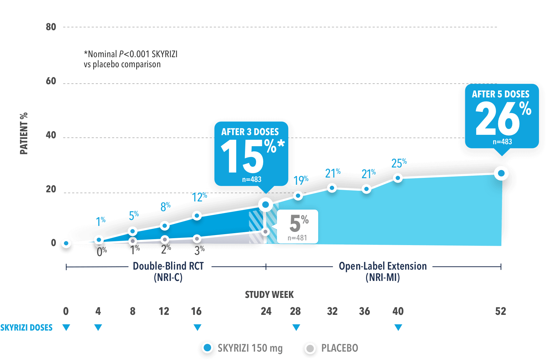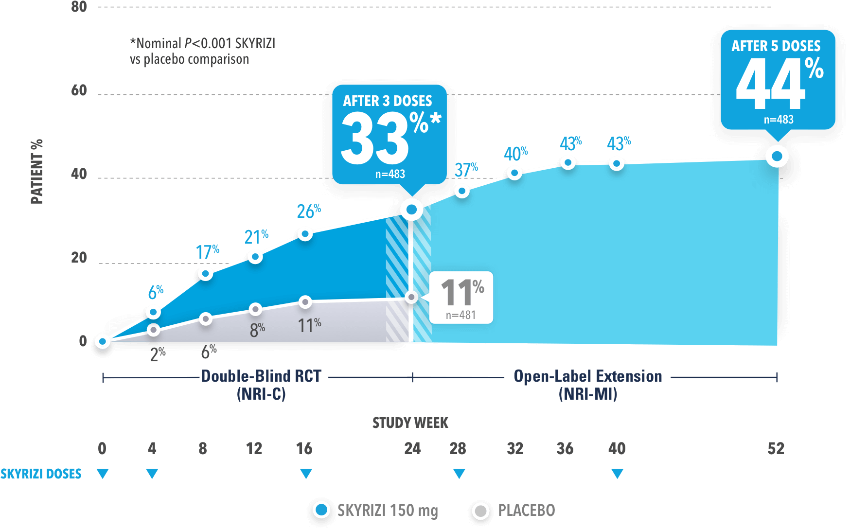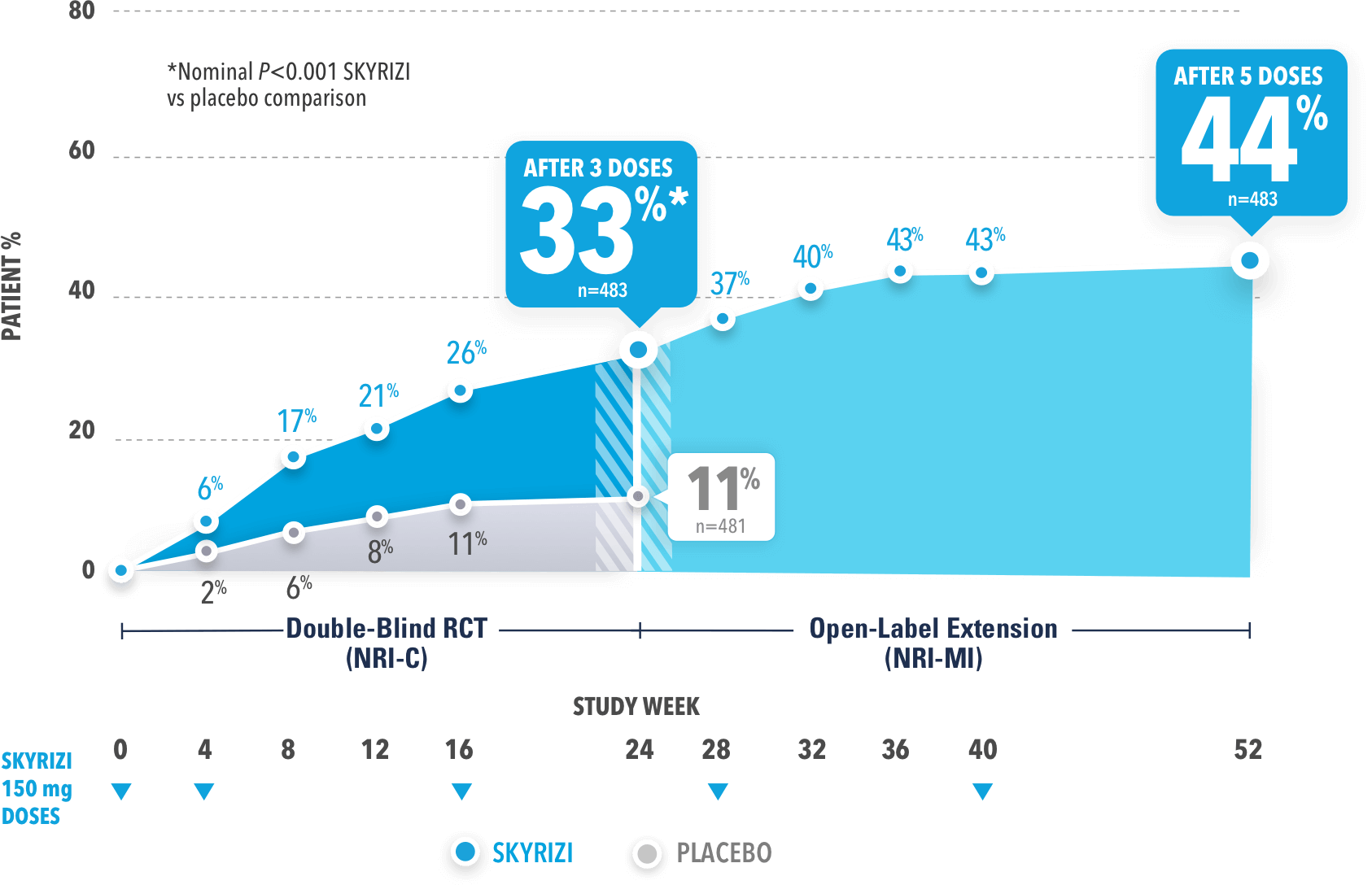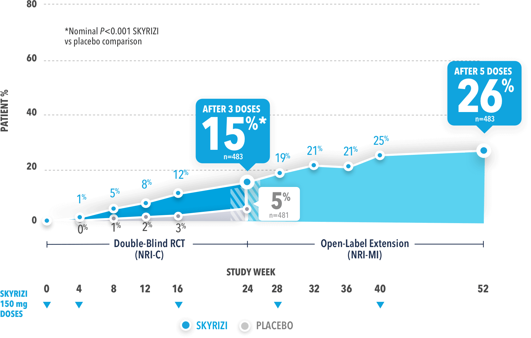 SKYRIZI 57% (n=483), PLACEBO 34% (n=481)