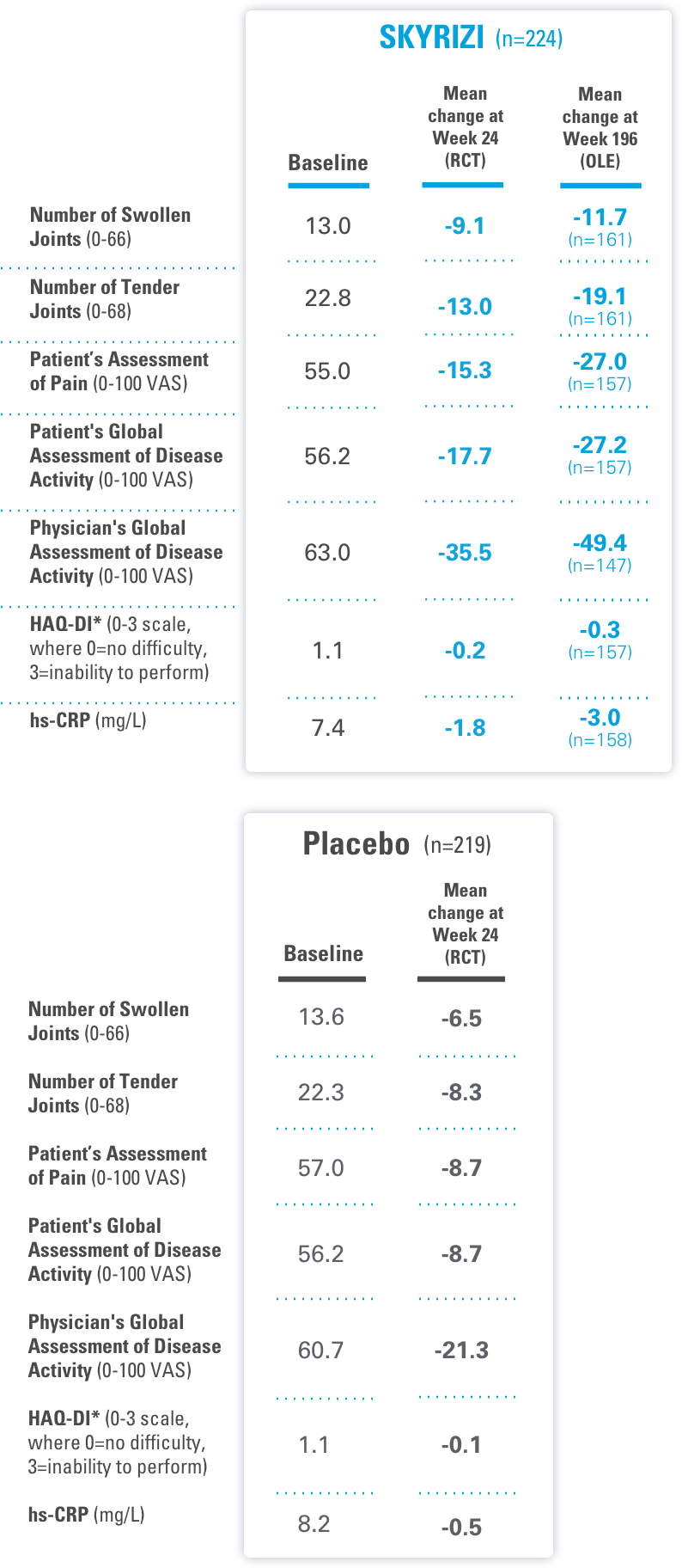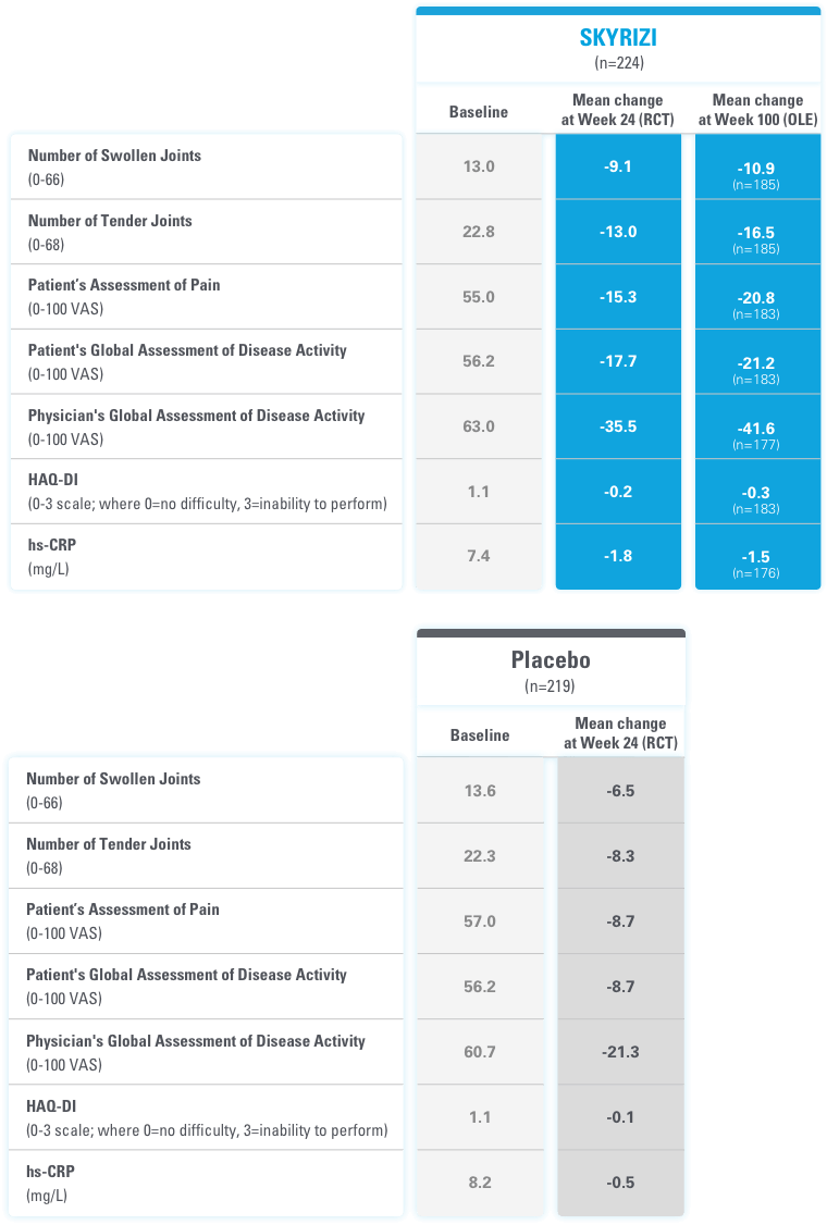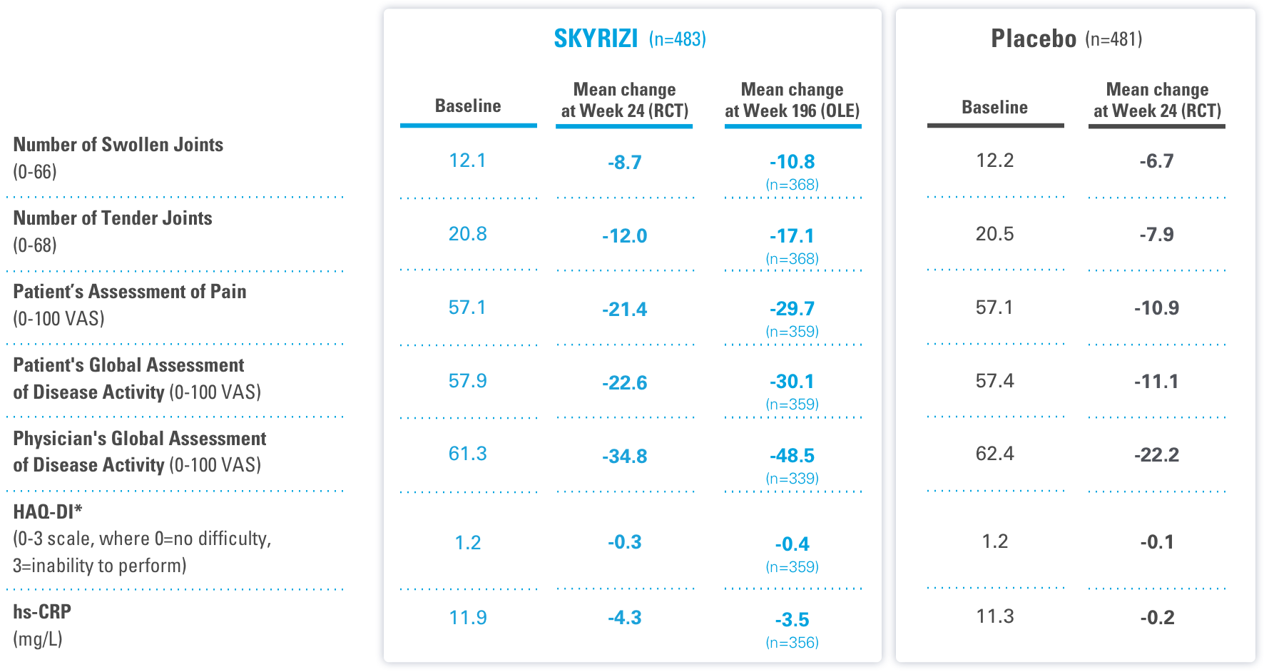 KEEPsAKE 1 (N=964) and KEEPsAKE 2 (N=443) were 2 randomized, double-blind, placebo-controlled studies that evaluated the efficacy and safety of SKYRIZI 150 mg vs placebo over 24 weeks with a long-term, open-label extension for up to an additional 292 weeks. Both studies enrolled adult patients with active psoriatic arthritis. In KEEPsAKE 1, the study population had an inadequate response or intolerance to at least 1 csDMARD, while in KEEPsAKE 2 patients had an inadequate response or intolerance to at least 1 biologic therapy OR to at least 1 csDMARD.1,4,5