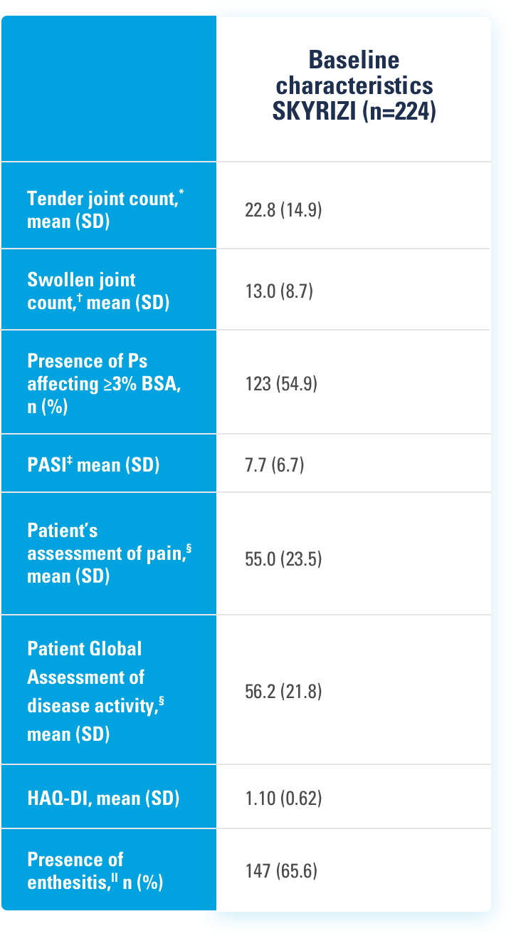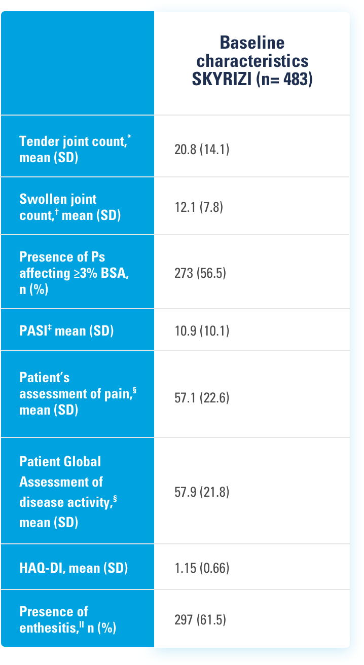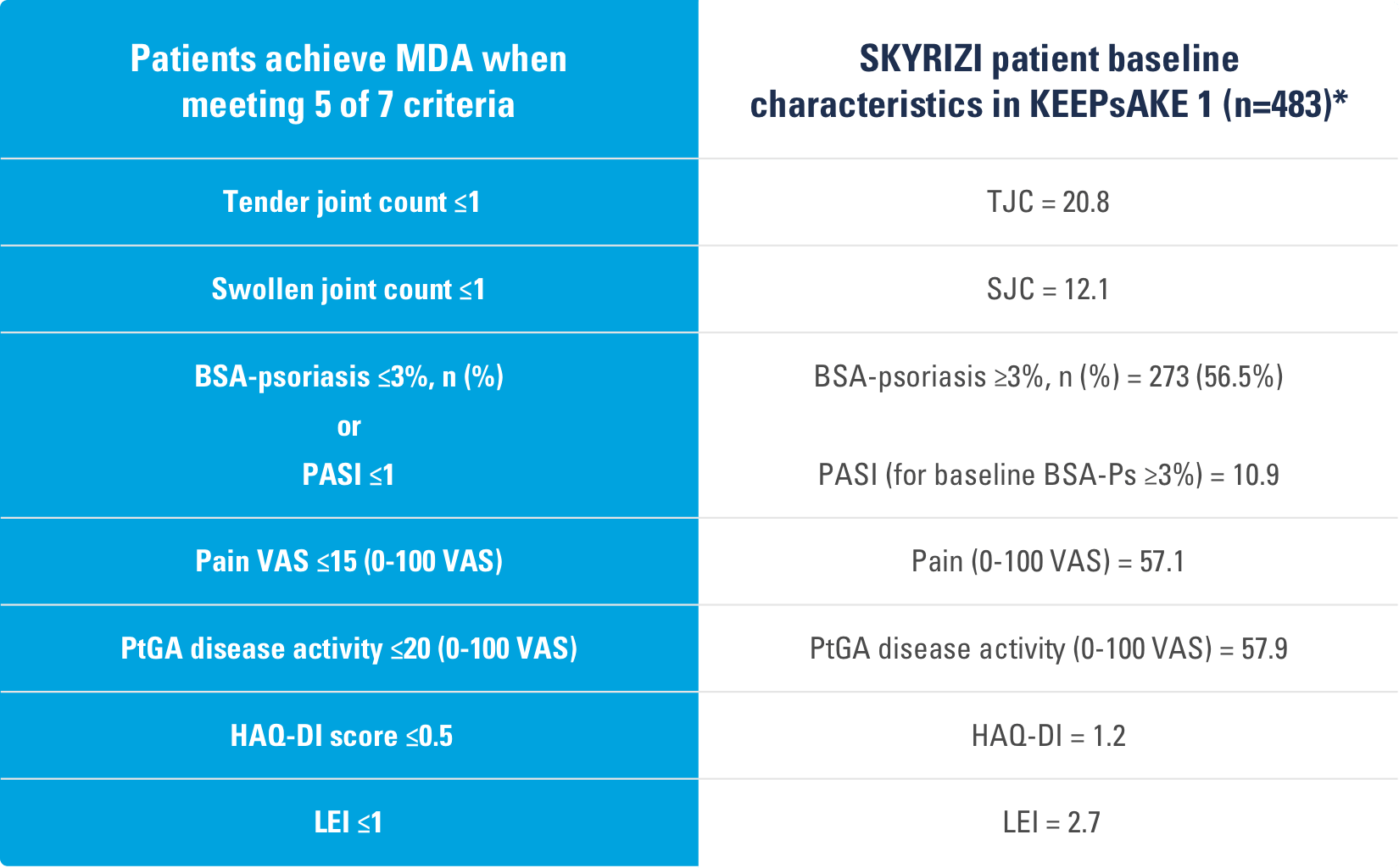 KEEPsAKE 1 (N=964) and KEEPsAKE 2 (N=443) were 2 randomized, double-blind, placebo-controlled studies that evaluated the efficacy and safety of SKYRIZI 150 mg vs placebo over 24 weeks with a long-term, open-label extension for up to an additional 292 weeks. Both studies enrolled adult patients with active psoriatic arthritis. In KEEPsAKE 1, the study population had an inadequate response or intolerance to at least 1 csDMARD, while in KEEPsAKE 2 patients had an inadequate response or intolerance to at least 1 biologic therapy OR to at least 1 csDMARD.1-3
