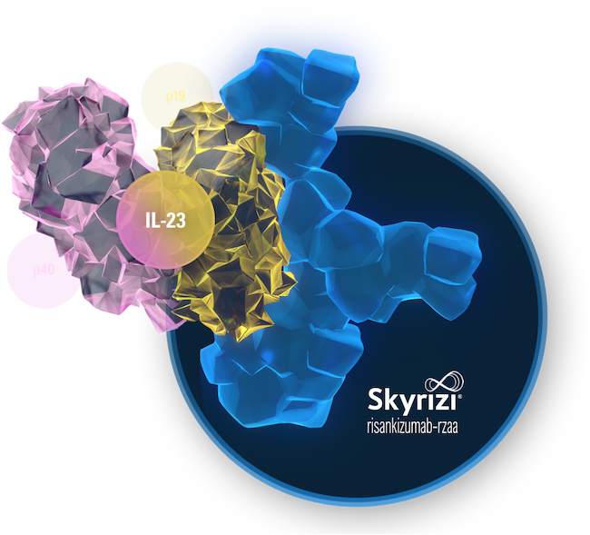 • Blocks IL-23 from binding to its receptor, which inhibits the downstream release of additional key proinflammatory cytokines such as IL-17A, IL-17F, and IL-221-3